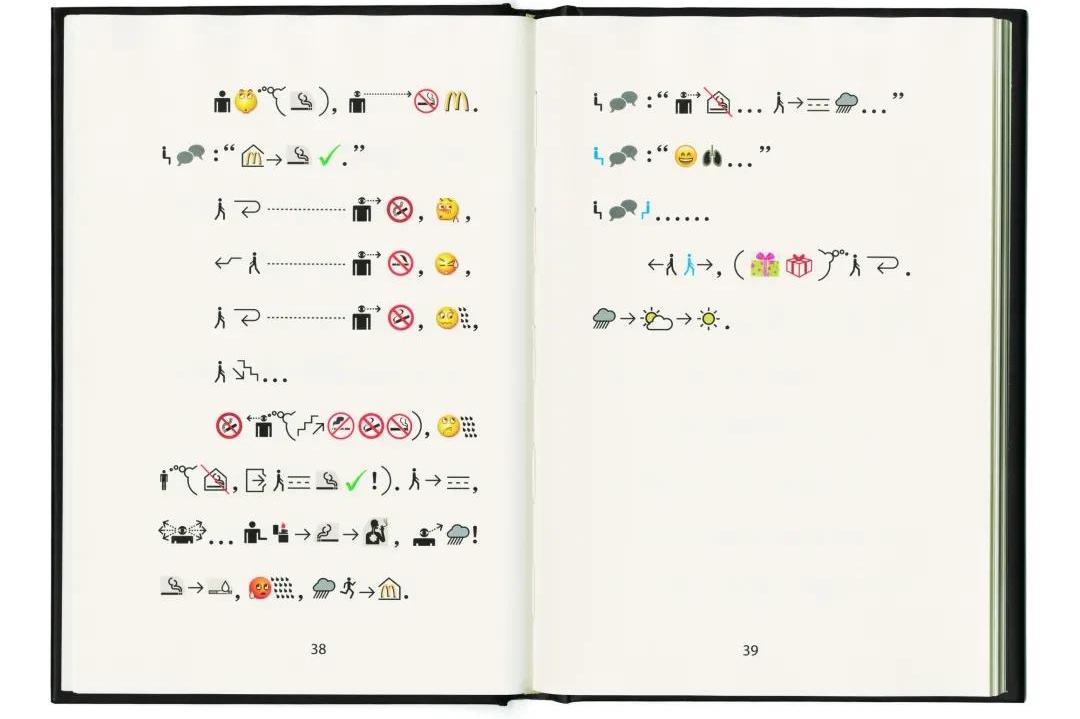 我們注意到MetaWords項目啟動時間比Facebook更名要早得多。對此,徐冰笑言:“同為MetaWords這也許只是巧合。”但MetaWords的基礎《地書》則確確實實是徐冰自2003年開始的藝術項目。彼時,被徐冰歸納為一段“生活在地區之間”的日子。頻繁來往于紐約工作室與全球多個策展地的徐冰大部分的時間在機場度過。在iPhone還沒有被發明出來之前,機場幾乎成為全球化的一個縮影。候機間隙,充斥在機場的大量標識符號吸引了徐冰的眼光。“那時候觀察到機場里的標識符號,在那樣一種全球化的時空里,能如此高效地、超地域地進行溝通,就感到很興奮,開始收集這些符號。”作為觀念藝術家的徐冰對于“生長性材料”有某種天賦式的敏感。“我覺得這些符號有很旺盛的生命力和延展性。”這種生命力一方面來源于標識符號傳遞信息的高效,一方面亦得益于高歌猛進的標準化工業生產讓更多標識符號納入了超地域的共識體系。接下來,徐冰用了十年時間以這些標識符號創作了一本無字之書《地書:從點到點》。《地書》以通篇的標識符號講述了白領“小黑”朝九晚五的生活。不管讀者是何種文化背景,只要是被卷入當代生活的人,就可以讀懂這本書。換言之,作為一個熟悉現代生活的自然人,可以無需其他語言介質——比如,先翻譯成中文——來理解這個故事。如果你更進一步,是一個emoji的愛好者,那你幾乎可以一目十行地閱讀小黑的生活,并且發出會心一笑。