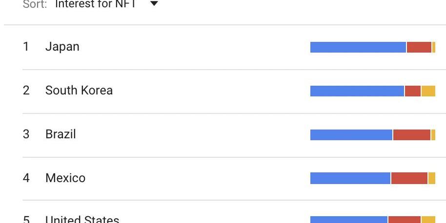 “NFT”,“ETH”和“Metaverse”在Google上搜索熱度的區域分布–2021年全球范圍統計數據來源:谷歌趨勢,NFTLabs從圖中可以看到,NFT和ETH概念全球范圍除少量地區外的都有很高的熱度。