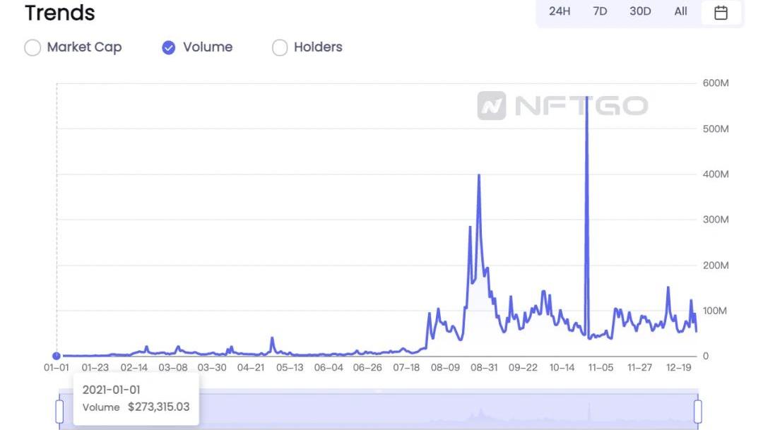 NFT市值數據來源:nftgo.io根據nftgo.io的數據顯示,截止2021年12月29日,NFT市值達到104.9億美金,相較于2021年1月1日6174萬美金,市值激增170倍,2021上半年平穩增長,2021年下半年增長速率增加。