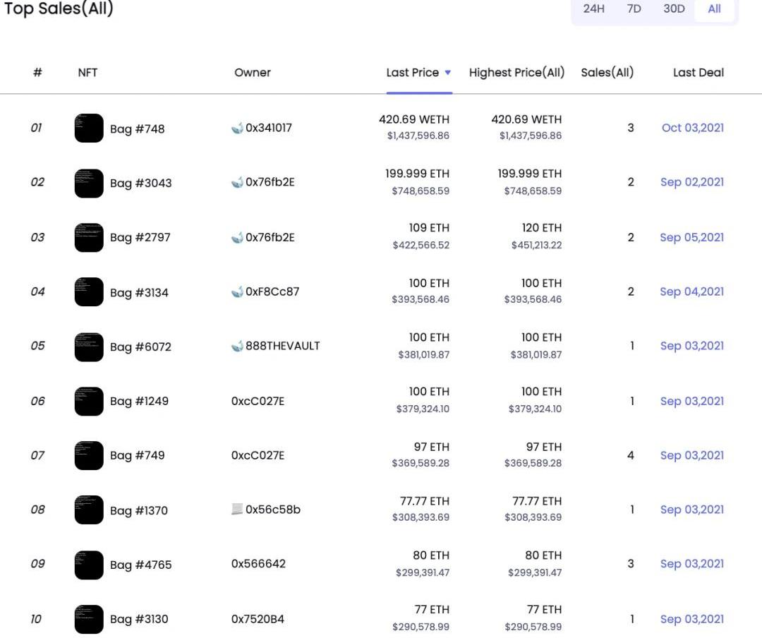 -Loot(forAdventurers)前十大成交紀錄,數據來源:nftgo.io-截止2021年12月30日,Loot(forAdventurers)最高成交價的NFT作品是《Bag#748》,最新以420.69ETH成交于2021年10月3日。CryptoPunks