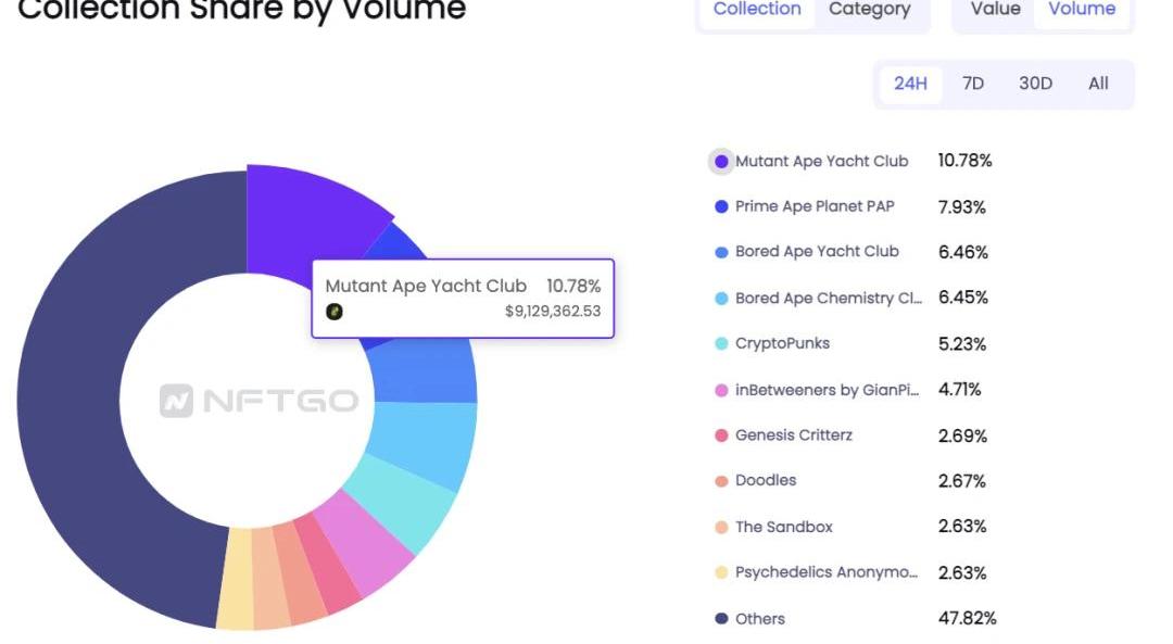 不同系列的NFT交易量占比數據來源:nftgo.io從截止2021.12.29的所有NFT交易量歷史數據來看,與NFT市值占比數據一致。然而從24H/7D/30D的數據來看會有一些有趣的發現,交易量占據榜首的系列輪流上場,2021年12月29日24H榜首是MutantApeYachtClub的10.78%,2021年12月最后一個星期的榜首依舊是MutantApeYachtClub占比13.38%,熱度持續。從2021年12月的數據來看,RTFKTCLONEX+Murakami躍居榜首,占月交易量的8.1%。24H/7D/30D的數據看來,與歷史榜首都不一致。NFT市場正不斷涌現新的爆款項目,未來可期。