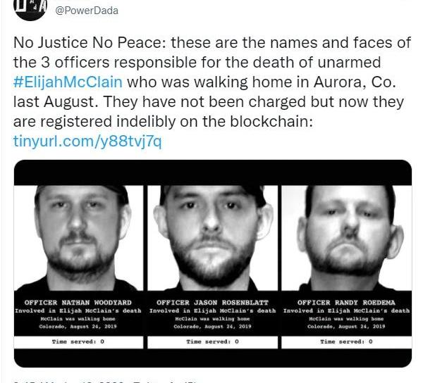 采用了Arweave儲存方案的項目生態圖,來源:verto除了加密商業,Arweave在一些社會活動中也扮演了重要角色。2020年,視覺藝術家組織DADA藝術合作社聯手DappHero創始人DennisonBertram發起NoJusticeNoPeace項目,旨在公布美國殺害黑人的警察的名字和肖像。該項目用到了OpenSea和Arweave,并利用Arweave的區塊鏈為每一個被殺害的人創建一個錢包,并持有與之相關警員的信息代幣。根據該項目在Arweave上的信息,在2013年至2019年期間,美國99%的警察殺戮事件并未受到法律制裁。受害者的照片在媒體上大量流傳,但對其進行暴行的警察卻無法查到。