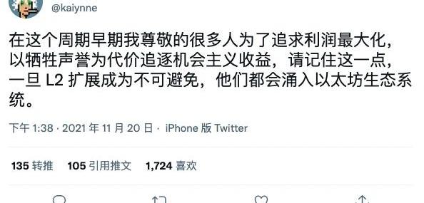 Solana、Avalanche等高性能公鏈的崛起,引發了一場「新興派」對陣「古典派」的KOL論戰。11月20日,Synthetix創始人KainWarwick發推稱,許多他先前尊敬的人為了投機而丟失聲譽,一旦以太坊L2成為不可避免的趨勢,他們都會涌入以太坊。這條推文精準觸動了三箭資本創始人suzhu的神經,他在評論區譏諷Kain為用戶選擇了最糟糕的擴展解決方案。要知道,三箭資本早期曾通過投資以太坊項目而獲得了大量財富,還曾于2020年投資了Synthetix。不過近期,該投資機構轉而投資Avalanche等新公鏈和鏈上項目,減少了對以太坊生態的關注。suzhu認為,仍在堅守以太坊的Kain是遲鈍的。11月21日,suzhu繼續輸出觀點稱,他已經放棄了以太坊,因為以太坊放棄了用戶,「新人已經用不起這條鏈了。」這條推文一出,以太坊社區坐不住了,Uniswap和Balancer的創始人們紛紛加入論戰,指責suzhu言論不當。最終,這場爭辯以suzhu的道歉而平息。看得出,隨著更多高性能公鏈的落地,以太坊正在成為一些人眼中的「古典派」。不過,從以太坊近期進展來看,suzhu針對其「放棄用戶」的言論并不客觀。當前以太坊L2網絡總鎖倉價值突破60億美元,創造歷史新高。其中Arbitrum在性能提升的基礎上,將交易Gas費降低至5美元左右,另一個側鏈dYdX則無需消耗Gas費。L2解決方案正在補足以太坊低效、高費的短板,與此同時,ETH2.0的開發也在進行當中,以太坊并不打算輕易讓出公鏈之王的桂冠。「ETH放棄用戶」觀點引加密圈KOL激辯