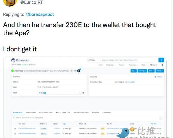 隨后,有網友質疑該筆交易的真實性。一位推特用戶附上了Etherscan的交易記錄截圖,稱JohnKnopf向購買BoredApe#9452的錢包地址轉了230ETH。