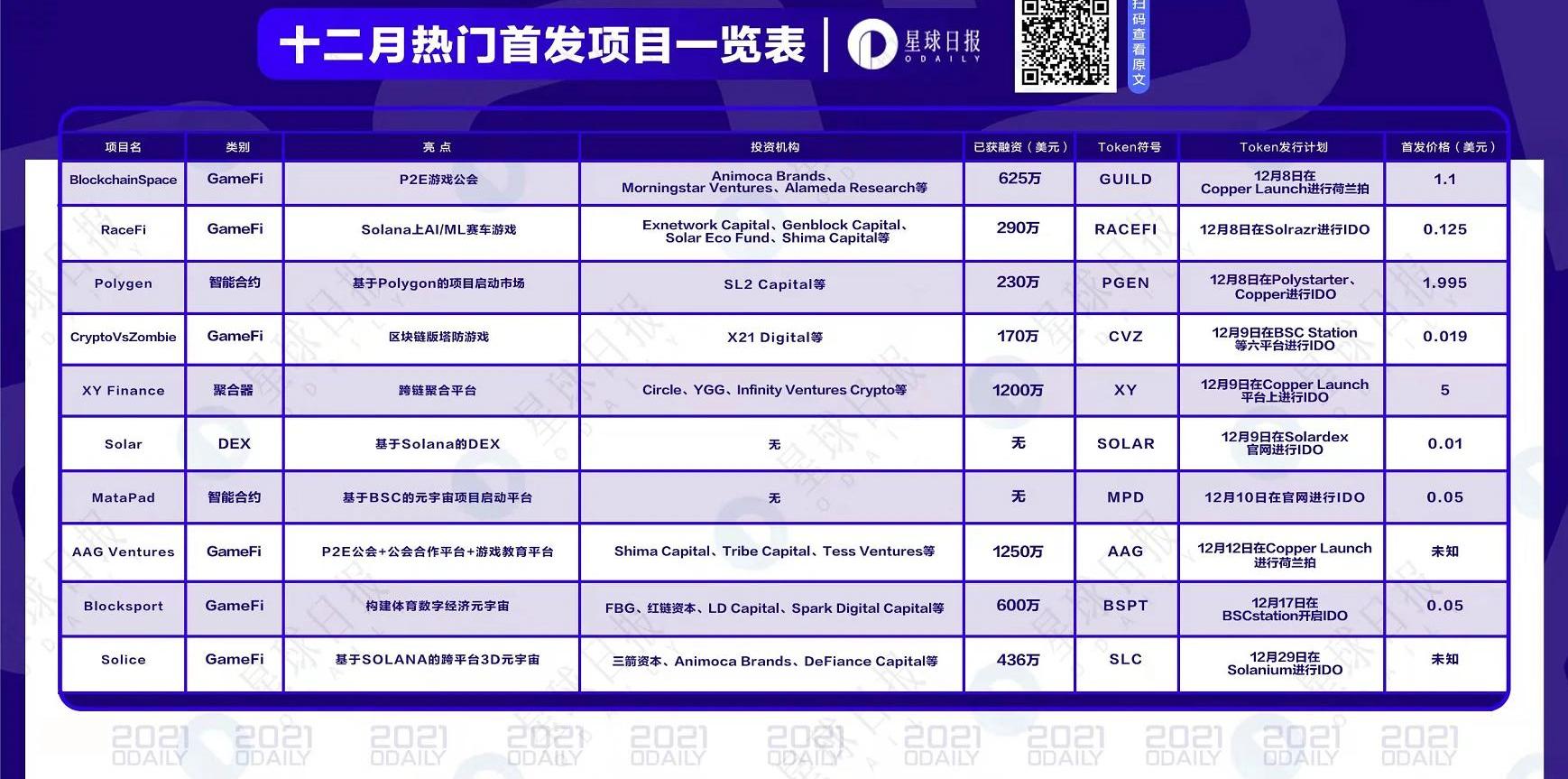 過去這段時間,雖然市場波動較為劇烈,但新項目依然層出不窮地涌現,資本、市場追捧程度依然不減。我們也整理了一份包含10個即將首發的項目名單,供讀者參考。從統計結果來看,新項目依然多在元宇宙、P2E領域,其中以公會類項目為主;并且,新項目多基于新興公鏈。此外,從融資形式來看,目前越來越多的項目傾向選擇CopperLaunch進行荷蘭拍,相比以往的白名單IDO模式,荷蘭拍也讓更多普通人能夠無門檻地參與項目,只不過造富效應相對減弱。以下為12月10個首發熱門項目的簡介,enjoy~