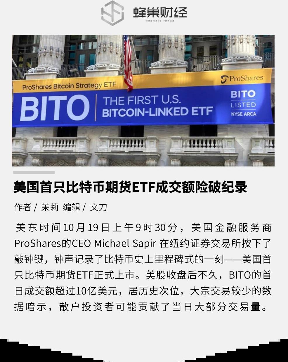 美東時間10月19日上午9時30分正值北京晚9點半,美國金融服務商ProShares的CEOMichaelSapir在紐約證券交易所按下了敲鐘鍵,鐘聲記錄了比特幣史上里程碑式的一刻,ProShares提供的比特幣期貨ETF正式在紐交所開啟交易,股票代碼為BITO的這只ETF開始劃出金融曲線。美股收盤后不久,BITO的交易量已超過2390萬股,按收盤價41.89美元計算,成交額接近10億美元。這只全新的ETF創下了首日成交額的歷史次高紀錄。但由于大宗交易較少,ETF投資分析師根據數據判斷,BITO的大部分交易似乎來自散戶。這種交易人群結構也正符合期貨ETF為普通投資者提供交易敞口的功能。BITO不是全球第一只有關比特幣的ETF基金,但它所代表的合規比特幣金融工具歷時8年才走入美國這個全球最為活躍的金融市場。作為監管方之一,美國證券交易所委員會SEC因此舉被加密圈視作「開放表現」,但BITO的通過本質上受到了1940年《投資公司法》的保護,規管方更多在于美國商品期貨交易委員會CFTC。比特幣期貨ETF的通過和交易開始影響BTC的現貨市場價格,盡管這種影響不是金融工具發揮直接作用的結果,而是「好消息」提振了市場情緒。比特幣再次突破了64000美元,它的歷史高點是今年4月時的64899美元。BITO首日10億美元成交額居歷史次高