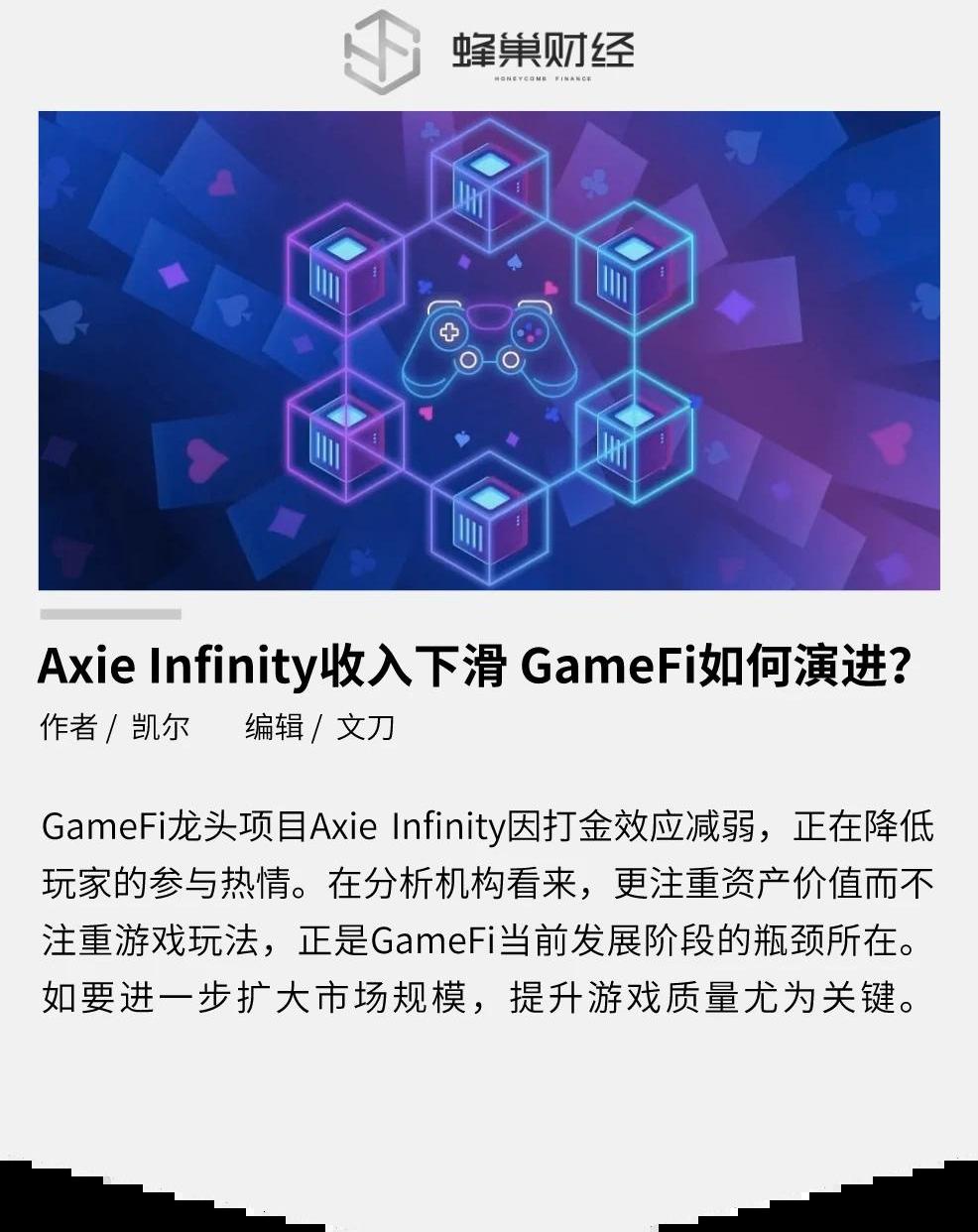 在DeFi爆發之后,區塊鏈應用生態進入了前所未有的高速發展階段,融合了DeFi、NFT和Game的GameFi逐漸成為鏈上的又一個明星賽道。GameFi火爆到什么程度?DappRadar數據顯示,今年10月,與游戲相關的活躍錢包數量占到了錢包地址總數的55%。與此同時,蓬勃發展的GameFi項目吸引了大量風投的關注,數據顯示,10月份,風投機構在GameFi相關項目上投資超過1.27億美元,超過20個游戲項目完成融資。從GameFi項目排行上看,小精靈養成戰斗游戲AxieInfinity仍是這個賽道的龍頭,它的發展狀況某種程度可以視作賽道風向標。作為PlayToEarn游戲的代表,AxieInfinity在今年三季度的收入超過7.8億美元,這個數字放眼全球單款游戲也居于第一梯隊,8月份,其單日收入一度超過爆款手游王者榮耀。不過,根據研究和咨詢機構Naavik近日的一份報告,AxieInfinity普通玩家的收入正在逐步下降。Naavik研究員在報告中寫道,經歷了幾個月難以置信的增長后,AxieInfinity的平民玩家每日收入已降至菲律賓最低工資線以下。這些平民玩家是游戲中的「打工人」,由于參與游戲打金必須收集至少三個小精靈,但每個小精靈的價格十分昂貴,因此有「贊助商」為這些平民玩家提供小精靈,并從中抽取分成。在AxieInfinity最初發展時,打金屬性是它成為現象級游戲的主要推力。當時,大量的菲律賓群眾通過參與該游戲獲得了遠超當地平均工資的收入,如今,該游戲的財富效應正在縮減。區塊鏈數據分析公司tokenterminal數據顯示,AxieInfinity的游戲收入在今年7-8月份達到峰值,當時其日收入通常超過1000萬美元。而近兩個月,游戲整體收入顯著下降,11月14日,該游戲總收入為690萬美元,僅相當于高峰時期的一半左右。游戲收入減少,玩家收入也跟著下降。有分析認為,玩家收入下滑,主要與游戲產出的「愛情藥水」SLP通證下跌有關。