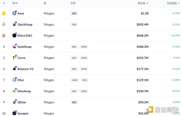 Polygon鏈上DeFi鎖定資產前十排名及鎖倉量,數據來源:Debank
