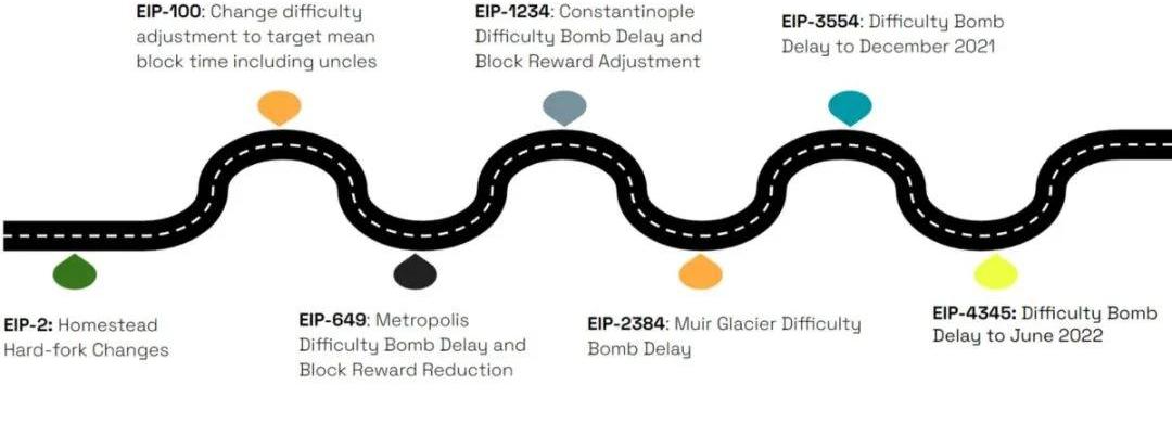 難度調整過程最初是為了促進向權益證明的過渡。隨著時間的推移,它獲得了迫使那些希望繼續運行以太坊的人升級其節點的額外屬性。這意味著留在舊鏈上不是一個選擇。時間線和相關EIP