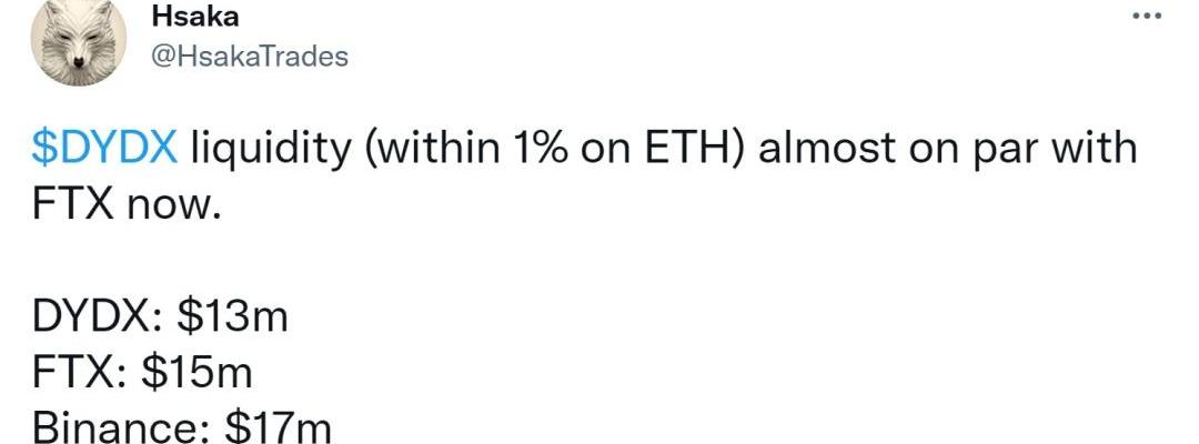 雖然本文主要關注的是通用計算ZK-Rollups的好處,但關于應用專用型ZK-Rollups的影響也是有很多需要闡述的。dYdX交易所由L2可擴展性引擎StarkEx驅動的dYdX是一個去中心化交易所,支持永續合約交易、保證金交易和現貨交易,同時也支持資產借貸。自從dYdX在L2網絡部署以來,該交易所上的ETH-USD交易對產生的流動性已經可以與FTX交易所相匹敵。雖然這些流動性可能是為了參與該平臺DYDX代幣獎勵計劃而流入的「唯利是圖的流動性」,但我相信,dYdX或一些其他的ZK-Rollup原生的DEX(去中心化交易所)總有一天會在交易量和流動性方面永遠超過所有的永續合約交易所。