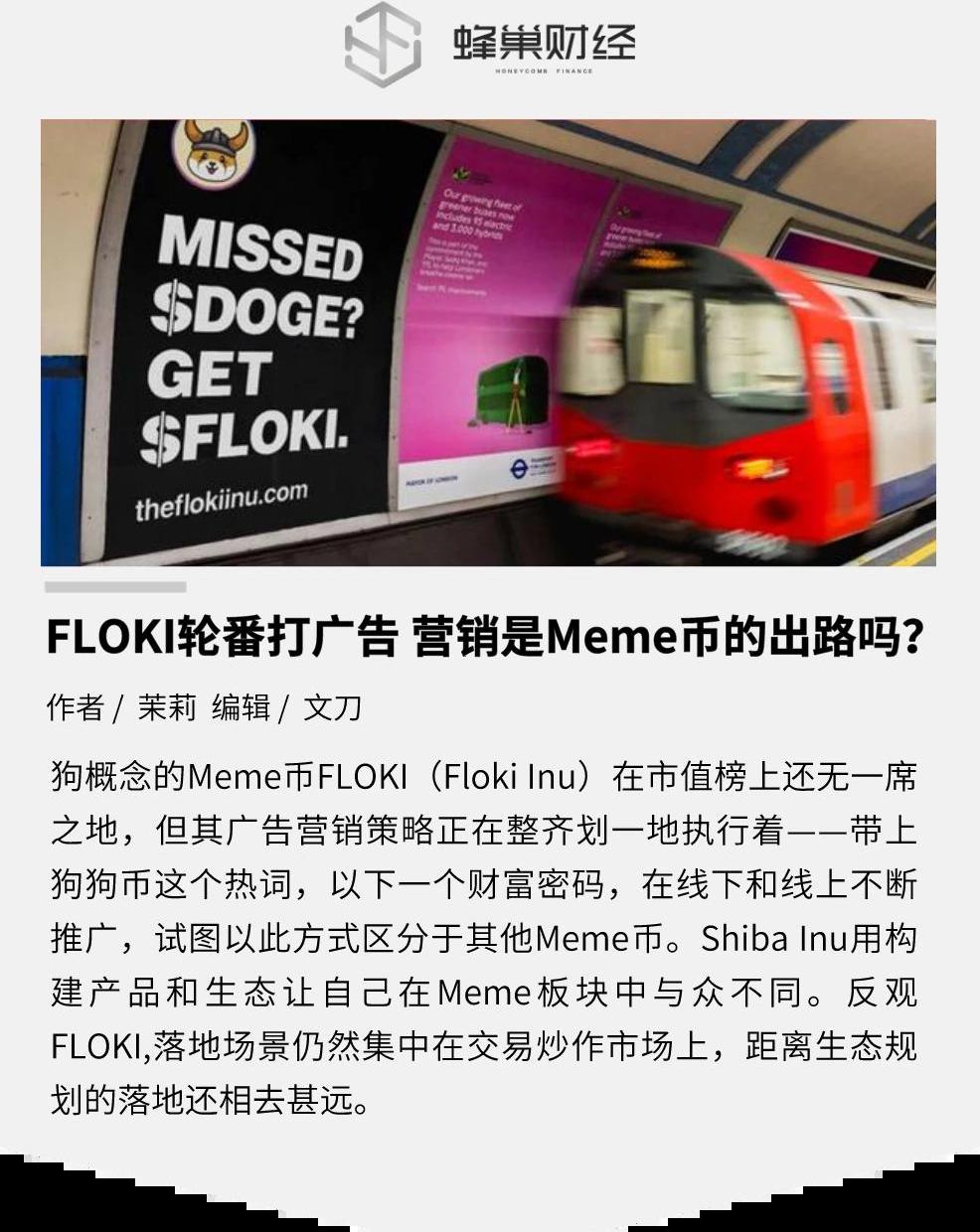 FLOKI交易量反映了一定人氣而在數據網站Coingecko收錄的Meme幣數據統計中,截至11月3日,FLOKI的24小時交易量超6938萬美元,可以排進整個板塊交易量的前五名,雖然只是SHIB的1.3%,但也可見其在Meme市場有一定的人氣。這個以馬斯克寵物狗的名字命名的Meme幣發行于今年8月,和特斯拉創始人沾邊為它帶來了第一波人氣,至少在8、9月份,它的宣傳方向始終圍繞著馬斯克進行,比如,「FlokiInu是馬斯克弟弟金伯·馬斯克的合作項目」,「FLOKI計劃打造以馬斯克家鄉為主題的NFT游戲」等等。到了10月,FLOKI的營銷方向變成了Meme概念幣的鼻祖狗狗幣DOGE,這一次,其營銷關鍵詞是「財富密碼」。10月6日,有營銷團隊在推特上放了一張照片,一張寫有「錯過了狗幣?買FLOKI」的廣告海報被掛在了倫敦地鐵站的立柱上,配文「這表明我們計劃將FLOKI品牌打造成倫敦和英國最熟悉的品牌之一,FLOKI廣告也將很快在倫敦的300輛公交車上上線!」FLOKI廣告出現在倫敦的地鐵站里英國《金融時報》聯系到了FLOKI背后的營銷團隊,對方表示,這個廣告旨在使FlokiInu在普通大眾眼中合法化。化名為Sabre的營銷團隊人員稱,他們希望激大眾對FLOKI品牌的信心,有必要將FlokiInu與加密世界中存在的許多騙局項目區分開來,「這些廣告活動將對倫敦公共交通系統的全面鋪開,」該人員透露,類似的廣告活動還會在洛杉磯和日本、中國和俄羅斯推出。《金融時報》詢問了關于FlokiInu背后團隊的問題,但對方「沒有回應哪些個人或公司實體控制該項目的評論請求」。FlokiInu仍然是一個匿名團隊,但在推特上小有名氣的KOL正在為它站臺。11月1日,推主SlumDOGEMillionaire告訴他的11萬粉絲,對于那些錯過狗狗幣DOGE的人來說,FLOKI是賺錢的重大機會,「是一個出路。」在這名KOL的推特評論中,狗狗幣的聯合創始人比利·馬庫斯出現了,「沒有所謂的出路,」他回復道,「只是早期的人變得更富有,后來的人變得更窮,除非后來的人中有新的更窮者出現,前人才能變得更富有,」他直白地抨擊道,「『它會讓你富有』這樣的廣告是虛偽的。」言外之意,比利·馬庫斯暗示FLOKI這類幣只是一場后者接盤前者的「龐氏」游戲。在他看來,加密財富創造沒有靈丹妙藥,只是有人選擇了一個被市場忽視的Token,然后該Token的突然暴漲營造了一種幸運的錯覺。他的觀點正符合狗狗幣因馬斯克喊單后暴漲的案例。脫離Meme幣印象FLOKI仍在掙扎