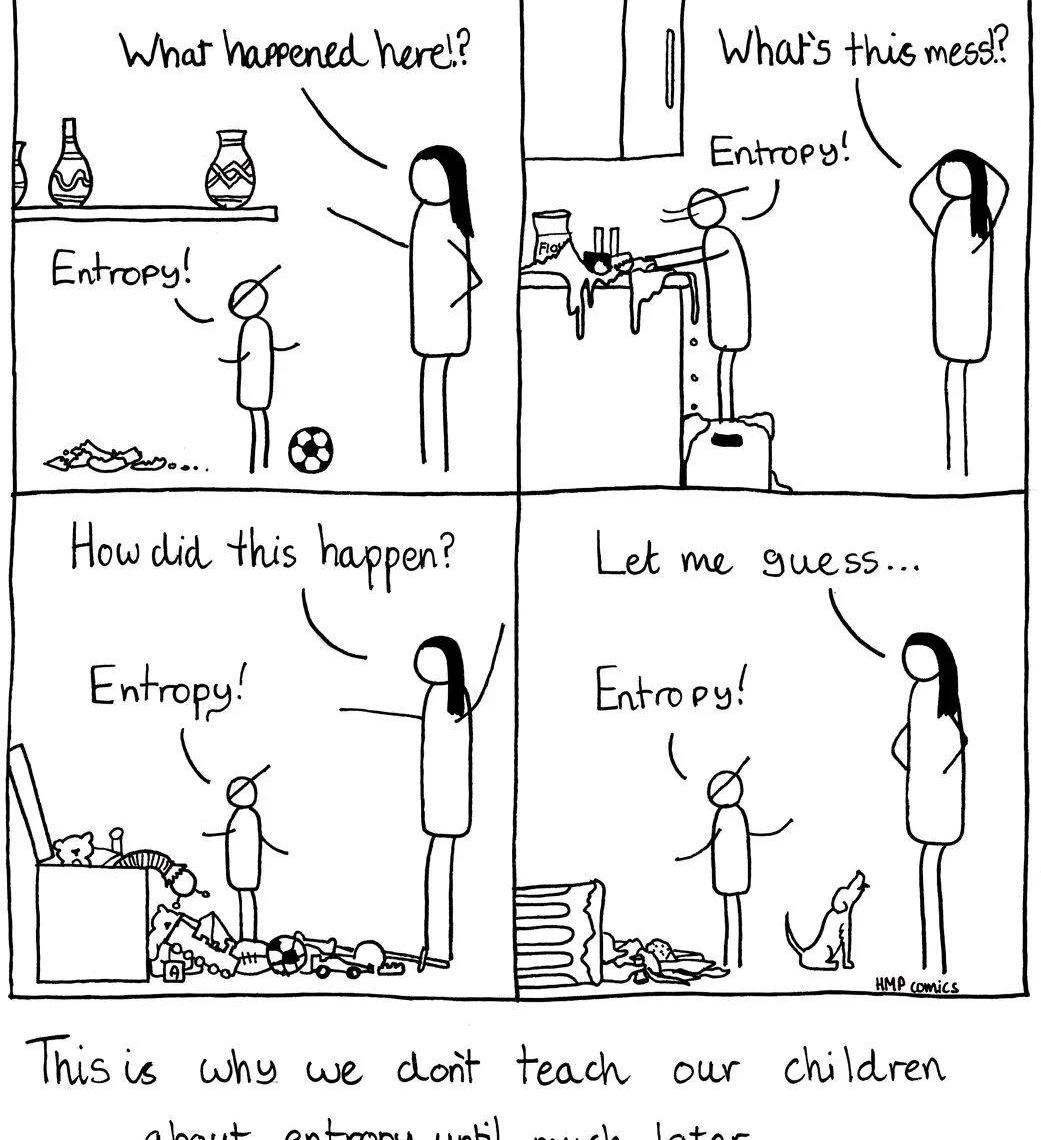 “我們都知道熵是不可逆轉的。你不能把煙和灰變成樹。”——艾薩克·阿西莫夫的《最后的問題》熵是熱力學的一條定律,它通常被定義為“無序或隨機性的量度”。一個更容易理解的定義可能是,它是“能量分布的度量”。在大范圍內,能量總是在擴散,沒有什么能阻止它。要熱一壺水,你可以用爐子。使用爐子的煤氣或電加熱水的行為是從最初的來源獲取能量并將其傳播到另一個來源——在這種情況下,來自電力或天然氣的能量轉移到鍋里,然后轉移到水。當水變熱,電或煤氣不再被使用時,水的熱量將一部分水變成水蒸氣,水蒸氣將水的能量轉移到空氣中。如果那罐水靜止幾天,水也可能自然蒸發——從而繼續能量的傳播。大量的能量分散在各處,而這些能量永遠無法被控制或完全恢復到原來的狀態。這種恒定的傳播是熵的增加。