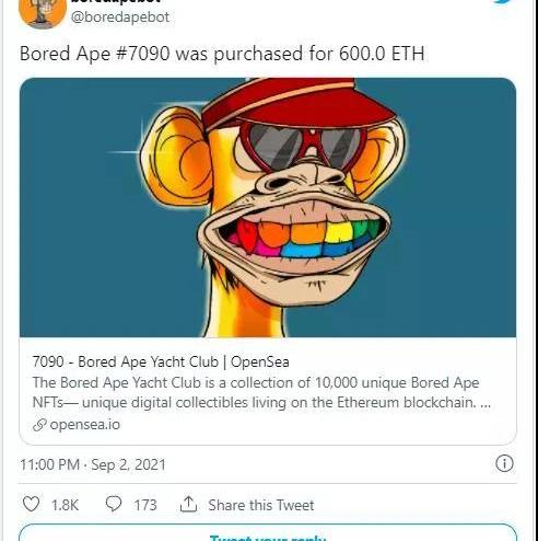 上圖:BoredApeYachtClub(BAYC)中的幾只無聊猿猴NFTs頭像根據CryptoSlam的數據,BoredApes的售價也很可觀:上周,一只BoredApeNFT以600ETH(當時價值約255萬美元)的價格被售出(見下圖);截至撰文時,該NFT收藏品系列的交易總額超過了4億美元。此外,當前有100多只BoredApeNFTs正在Sotheby's(蘇富比拍賣行)進行拍賣,預計拍賣總額將高達1800萬美元!