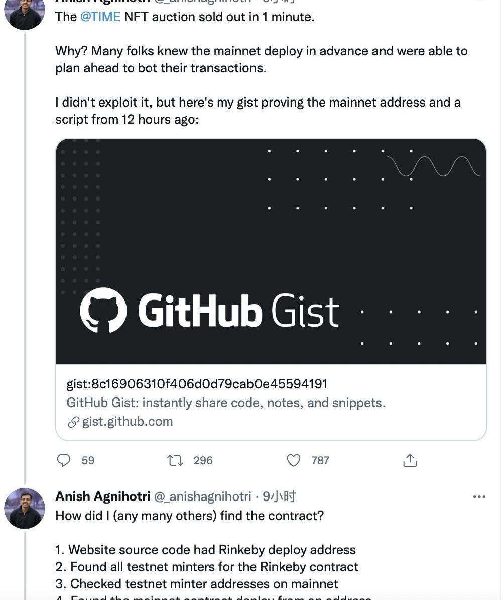 “《時代雜志》的NFT拍賣會在1分鐘內售罄。為什么會這樣?因為許多人提前知道主網拍賣合約部署,并能夠提前計劃以機器人搶先進行他們的交易。我是如何找到合同的?1.網站源碼有Rinkeby部署地址2.找到Rinkeby合約的所有測試網鑄幣者3.檢查主網上的測試網鑄幣地址4.從一個地址找到主網合約部署5.合約被驗證NFT開發者:如果您想保持NFT鑄造過程的公平性,請嘗試以下解決方法:-限制每個錢包的鑄造數量-使用沒有鏈接的不同地址進行主網鑄造合約部署-直到鑄造開始之前才進行驗證合約-最重要的是,不使用FCFS拍賣注意:通常,NFT鑄造過程中的機器人問題并不是《時代》NFT計劃獨有的。任何“先到先得”類型的NFT鑄造都必然會經歷相同水平的機器人活動,并將使拍賣推高gas市場。額外的鏈上或鏈下信息只會使機器人更容易搶占先機。”截至發稿時,《時代》雜志方面尚未對鑄造過程中發生爭議發表評論。本文來自Defi之道,星球日報經授權轉載。