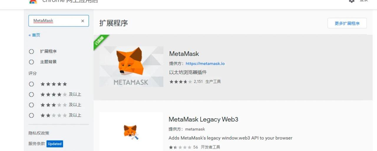 2.搜索并安裝MetaMask擴展,在Chorme?打開:https://chrome.google.com/webstore/search/MetaMask