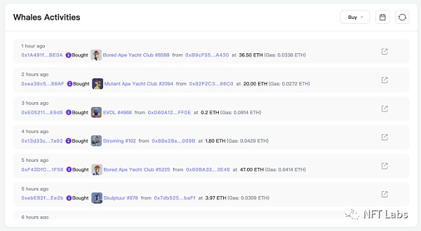 此外,可以對巨鯨實時交易的時間、交易行為(購買、出售、發送、鑄造等)、NFT系列及編號、交易對方地址、價格及gas信息。同時支持對項目名稱、交易行為、時間的維度進行篩選。