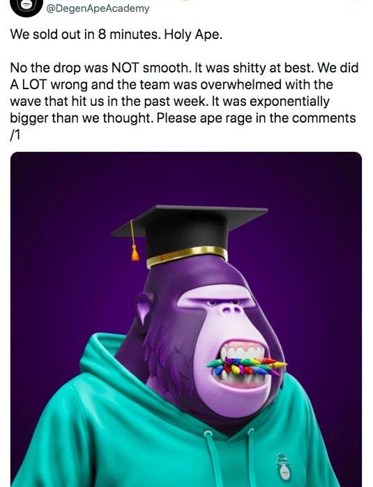 NFT是一種存儲在區塊鏈上的數字收據,代表著從藝術品、音樂甚至門票銷售到演唱會的任何東西的所有權。以太坊一直是這一利基市場的頭號網絡,但Solana也在著眼于分一杯羹。DegenerateApeAcademy背后的團隊表示,盡管這次發布“充其量是一團糟”,因為很多事情都出了問題,但他們對社區的興趣感到“不知所措”。DegenerateApeAcademy在推特上寫道:“它比我們想象的要大得多。”