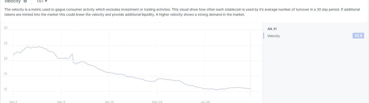 美聯儲公布的VelocityofM2MoneyStock數據,https://fred.stlouisfed.org/series/M2V而在Terra網絡統計的數據中,貨幣流速僅指代Terra穩定幣換手的頻率,與具體的消費類型無關。我們發現,UST的貨幣流速在今年2月中下旬見頂后一直處于下降通道中。