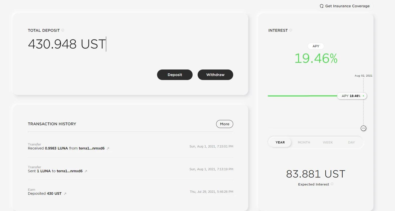 Anchor產品存款界面,https://app.anchorprotocol.com/earnAnchor面向儲蓄用戶的收益率是比較固定的,可由其社區治理來調整目標利率,目前為19.46%。相對大部分DeFi產品的浮動存款利率,Anchor的固定利率更加符合傳統金融用戶的理財習慣,這種又高又穩定的“理財產品”是一種粗暴有效的資金拉新手段。大家還記得幾年前中國阿姨們追逐年化10%的P2P理財時的狂熱嗎?在加密貨幣牛市中,由于各類項目估值的泡沫化,項目代幣的價格也水漲船高,加上投機和套利需求的活躍,穩定幣的借用需求大增,這使得各類挖礦收益長期能保持在二位數甚至三位數。但當加密市場進入熊市,獎勵的代幣價值下跌,投資和套利需求萎縮,儲蓄收益自然也大幅下跌。