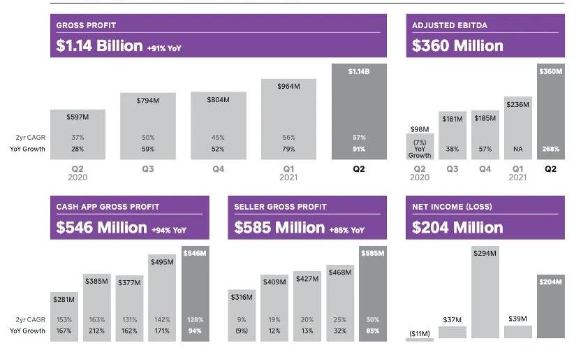 今年2月,Square以1.7億美元的購買了3318枚BTC,將比特幣持倉量從去年10月4709枚擴充到了8027枚。然而,加密資產市場5、6月份的行情,給Square持倉的比特幣帶來了減值損失,其Q2財報中披露,比特幣為其帶來的減值損失達4500萬美元,導致其在比特幣上的投資收入和利潤下降了22.3%。盡管如此,這家移動支付巨頭的Q2毛利潤仍然比去年同期增長了91%,達到了11.4億美元;其拳頭產品CashApp,毛利潤達5.46億美元,同比增長了94%。