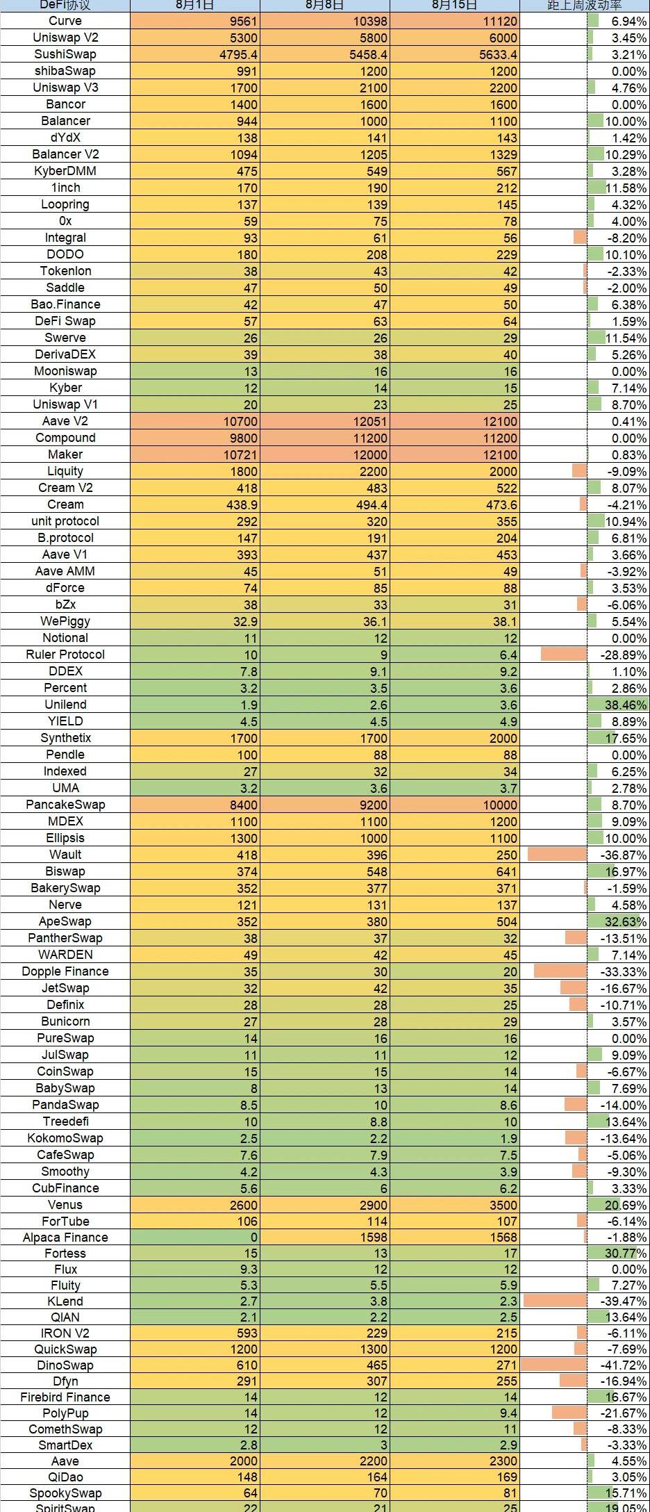 來源:Debank統計日期:2021.8.15近期TVL增量情況較好協議