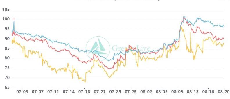 播報數據由Greeks.live格致數據實驗室DataLab和Deribit官網提供。大宗看漲成交量明顯增加,當日成交19095幣,占比26%,成交IV接近于盤口。這與前幾日成交主要依賴盤口的情況明顯不同,主要原因是下周即將進行月度交割,大機構需要調整自己的頭寸敞口,同時短期投機者也有比較強的交易需求,供需兩旺。比特幣Reddit粉絲幣價比70,七日粉絲復利年化增速34%以太坊Reddit粉絲幣價比341,七日粉絲復利年化增速44%以上參數為個人觀察市場熱度使用的指標,詳細內容可以參見之前的文章《幣的估值指標:Reddit粉絲幣價比》期權持倉量16.2萬張,價值76億美元,期權成交量1.6萬張。10d69%30d71%90d82%1Y78%各標準化期限隱含波動率:今日:1m87%,3m93%,6m96%,DVol94%8/19:1m87%,3m93%,6m96%,DVol95%比特幣小幅反彈,期權的成交量上升,帶來了比較多的短期合約增倉。但是IV變化不大,市場對價格的分歧比較明顯,但在期權的價格上達成了默契。
