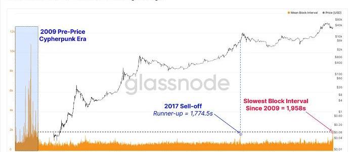 上圖:平均區塊間隔實時圖表不過,如果我們把時間軸拉長一點,會發現這是自2009年密碼朋克時代以來,比特幣創下的最慢平均出塊時間,之前最長的平均出塊時間大約為1,774.5秒,是在2017年數字貨幣市場沖頂后回調時出現的。