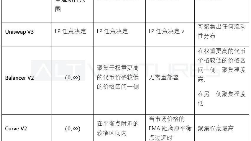 通過多方面的比較,可以看出每個協議都采取的不同的方法來契合LP和交易者們的多方面不同需要。UniswapV3給予了LP最大的靈活性,幾乎所有參數都可以由LP自主決定,而團隊并沒有額外加入更多輔助特性,以保持協議的簡單化。而LP則需要管理自己的各種風險。Curve歷史上曾專注于穩定幣交易對,此新版本V2致力于擴展所涵蓋代幣的種類。不同于穩定幣,非穩定幣交易對的市場中價可能會偏移到新的活躍區間,所以此協議可根據內置Oracle的喂價調整流動性聚集范圍,而無需LP自己重部署流動性區間。此種設計對個人投資者更加友好,但限制了開發更復雜的定制化做市策略的可能性。BalancerV2在同一流動性池中容納了多于兩種的代幣,并且賦予不同的權重,這滿足了一部分LP差別對待不同種代幣風險敞口的需求。通過增加一側風險波動的方式,來降低另一側的風險。引用文獻G.Angeris,A.Evans,T.Chitra;Whendoesthetailwagthedog?Curvatureandmarketmaking,2020.HaydenAdams,NoahZinsmeister,MoodySalem,RiverKeefer,andDanRobinson.Uniswapv3Core.(2021).MichaelEgorov,CurveFinance(SwissStakeGmbH).Automaticmarket-makingwithdynamicpeg(2021)FernandoMartinelli,NikolaiMushegian.BalancerWhitepaper(2019)