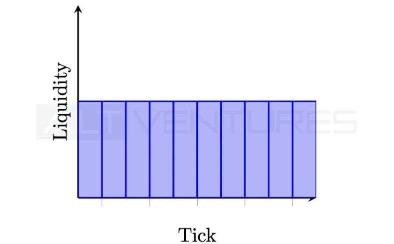 Table4流動性聚集方式UniswapV3允許每個LP設置任意的流動性范圍,以期望總體流動性聚集在一個最活躍的區間。但是,理論上,根據每個LP的自主決定,流動性可以被塑造成任意分布。舉例來說,一個和UniswapV2等效的流動性分布入下圖所示: