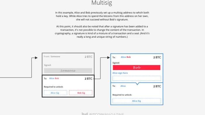 閃電網絡的第三個模塊也很好理解:多簽名地址。。)顧名思義,多簽名地址就是需要多個私鑰來“解鎖”、使用比特幣的地址。多簽名地址的條件可以設置得很多樣。比如,可以要求在3把私鑰中要有2把參與,才能轉出比特幣;或者是其它的數量要求。閃電網絡一般使用2-2的多簽名要求。要從這樣的地址中轉出比特幣需要提供跟這兩把私鑰相關的兩個簽名,少一個都不行。
