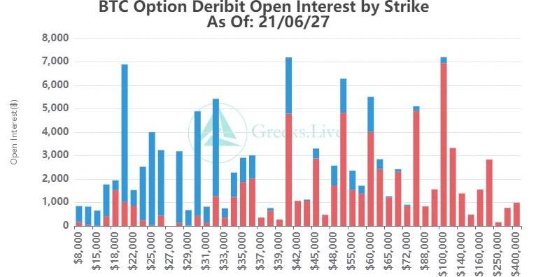 目前期權持倉量最高的是12月期限,約2.94萬幣,7月期限期權持倉約2.4萬幣。