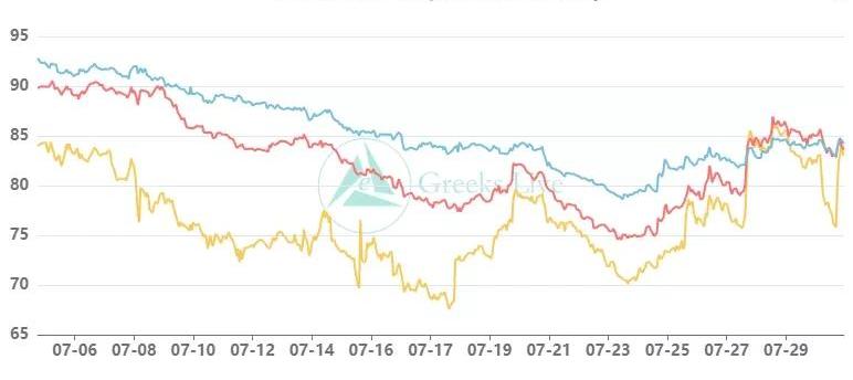 以太坊期權持倉量100萬張,價值25億美元,成交量15萬張。10d84%30d82%90d140%1Y109%各標準化期限IV:今日:1m96%,3m98%,6m98%7/30:1m100%,3m100%,6m100%以太坊在月度交割日交易量創519以來新高,雖然昨日波動略大于平時,但月度交割釋放的資金壓制力較大,各期限IV都下降至100%以下,目前的IV基本與月初持平。
