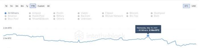 比特幣的哈希率在6月份下降了40%,這成為比特幣歷史上最大的跌幅之一。雖然有礦工在繼續挖礦,但是哈希率的下降使得試圖攻擊比特幣網絡的成本降低。然而,比特幣有吸引礦工重返挖礦的激勵措施。首先,由于比特幣的價格下跌幅度小于其哈希率,因此盡管挖礦收入仍然相對較高,但它的挖礦競爭力較低。這使得對于比特幣的挖礦更有利可圖,從而吸引更多的礦工。此外,比特幣的挖礦難度剛剛下降了創紀錄的28%。因為網絡難度會動態調整,旨在使比特幣挖礦變得更容易,降低挖礦成本,從而使其對于新老礦工重返挖礦更具有吸引力。2.比特幣礦工似乎一直在拋售自5月中旬以來,礦工地址中的比特幣數量已大幅下降。在春季略有增加之后,挖礦儲量似乎已達到峰值——214萬枚。