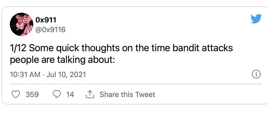 在目前的狀態下,以太坊是一個使用中本聰共識的工作量證明系統;這意味著保護網絡的礦工之間的網絡共識依賴于原始計算能力。這也意味著交易只有概率最終性;一個交易被包含在一個區塊中的時間越長,該交易被恢復的可能性就越小。因此,通常建議工作量證明區塊鏈上的用戶在考慮“完成”交易之前等待。在以太坊上,假設交易在7個區塊確認后完成通常是安全的。在工作量證明系統中,兩個礦工可能同時挖出有效區塊并嘗試將這些區塊傳播到網絡。最終發生的事情是網絡留下了兩個有效區塊,但在下一個挖礦競賽開始之前,只能將一個添加到鏈上。這意味著其中一個人挖出的塊必須變得“陳舊”或被丟棄。這不是很好,原因有兩個。首先,生產陳舊區塊的礦工白白浪費了他們的資源!其次,這使得網絡容易出現中心化風險,因為礦工急于確保他們有足夠的算力以避免生產過時的區塊。有關這方面的更多信息,請查看此內容。在比特幣網絡上,10分鐘的區塊時間和分分鐘的傳播時間使得陳舊區塊的概率相當低。然而,在以太坊上,區塊時間要短得多——大約12到13秒——產生陳舊區塊的可能性要高得多。這使得上述資源浪費和中心化的問題更加相關。以太坊通過使用GHOST協議的修改版本來解決這個問題。GHOST協議是在2013年設計的,旨在解決快速區塊時間鏈中陳舊區塊的精確問題,基本前提很簡單:礦工接受的“最長”鏈是具有最高累積工作量證明難度的鏈,包括作為當前區塊祖先的后代的陳舊塊。這樣的區塊被稱為“叔塊”。以太坊在GHOST上使用了一個變體,它使用相同的原則選擇難度最長的鏈,但在難度計算中不包括叔塊。它分配一些區塊獎勵給叔塊,讓這些區塊中的交易可以訪問,但不包括主鏈中的那些交易。采用新的“最長”鏈并忽略陳舊塊的過程稱為鏈重組。那么這與MEV有什么關系呢?有兩種主要方式可以激勵網絡用戶利用叔塊和重組。第一個已經在實踐中發生并且威脅性要小得多,它被稱為“叔叔強盜”,由Flashbots獨家啟用。截至2021年7月中旬,Flashbots使用其MEV-Geth客戶端獲得了約86%的以太坊算力支持;但是,Flashbots捆綁包仍然有可能包含在叔塊中,從而為UncleBandits創造機會。這最初是在羅伯特米勒的一個帖子中詳細介紹的。由于包含在叔塊中的交易不會改變以太坊狀態,但對其他人仍然可見并且是有效交易,精明的MEV搜索者可以查看叔塊Flashbots捆綁包并發布一個新捆綁包,其中包含原始捆綁包中的一些交易用自己的交易來捕捉主鏈上的套利機會,僅UncleBandits是沒有協議威脅的;最終,它們是捆綁包被概率性地包含在叔塊中的結果,而其他人則抓住了邊緣化的機會。不過,UncleBandits的下流大表哥是時間匪徒,更讓人擔憂。正如MEV的開創性研究論文中詳述的那樣,時間匪徒是一種理論攻擊,當來自MEV的獎勵開始超過區塊獎勵時就會發生。時間匪徒攻擊的前提是,可以訪問大量以太坊算力的礦工可以通過嘗試重新挖掘以前的區塊、捕獲這些區塊中的所有MEV并重組鏈來使以太坊的時間倒轉。最簡單的方法是租用51%的算力;在這樣做時,攻擊者將返回一定數量的區塊,獲取現在和過去這些區塊之間的所有MEV利潤,并使用該利潤來補貼攻擊。