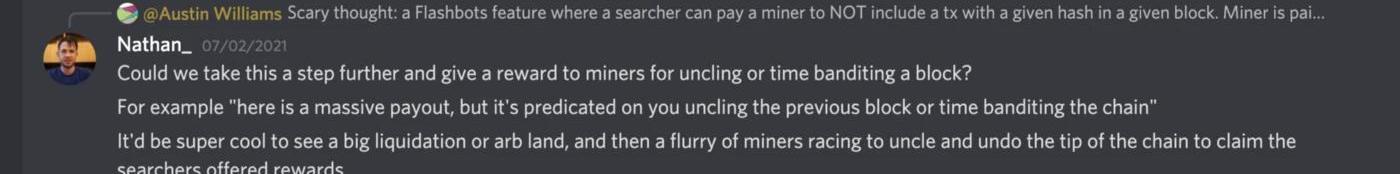 AustinWilliams:有一種可怕的想法,這是一種flashbots功能——搜索者可以向礦工支付費用,以在給定塊中不包含具有給定hash的tx。如果該tx不在目標區塊中,則礦工獲得報酬。使用Flashbots來激勵審查的這種想法有點可怕。這也與Flashbots減輕MEV造成的負面外部性的使命背道而馳。盡管如此,正如另一位社區成員很快指出的那樣,這種審查在經濟上是不可行的,因為它需要支付比想要包含相同交易的搜索者或用戶更多的費用: