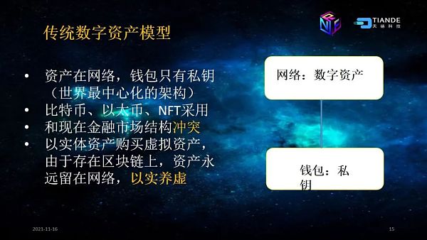 以太坊、比特幣的整個市場結構跟我們現在金融系統機構是有沖突。假如你的賬戶有一百萬,準備到銀行把一百萬人民幣拿出來,沒有哪一家銀行敢說“不行,你只是擁有鑰匙,錢永遠放在銀行里面”?所以,可以看出這是有沖突的。在這種情況下,誰擁有最多比特幣或以太幣,誰就是全世界最有錢的人,這也就是為什么他們的市值增長這么快。但以太幣只存在于以太坊上,說白了這就是“以實養虛”。我們自己買來買去,買了半天看誰最有錢,結果還是發行比特幣和以太幣的人最有錢。我們拿自己的錢養肥了以太坊、養肥了比特幣,這就是以實養虛。這就是傳統數字資產模型。