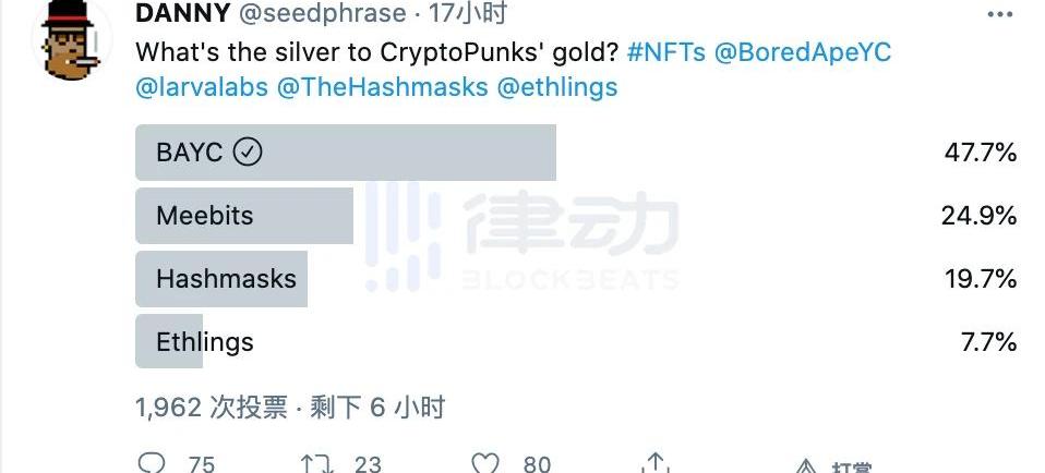 更有趣的是,DANNY也發起了一個投票,只不過他仍舊最偏愛CryptoPunks,于是他問道:「如果CryptoPunks是黃金,那白銀是什么?」,在投票結果中,猿猴們依舊位列第一。