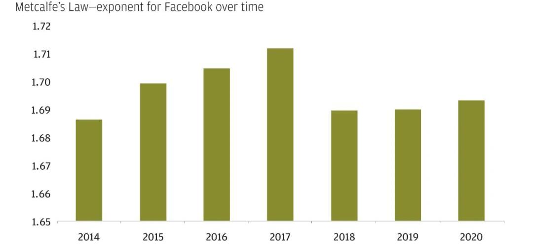 圖片來源:Yoo,ChristopherS.,"NetworkEffectsinAction"(2020).FacultyScholarshipatPennLaw.2236.梅特卡夫定律幫助我們理解為什么Facebook現在是一家市值近1萬億美元的公司。從2014年到2020年,若將歷史月活躍用戶與流通股價格聯系起來,我們可以以n^1.7的函數,使用「廣義梅特卡夫定律」,對Facebook的歷史股價進行估算。也就是說股票的價格可以通過活躍用戶數量的函數來表示。例如,截至2020年12月31日,月活躍用戶數為28億人;這意味著FB的總價值約為2.8^1.7,即7250億美元的市值,合每股約255美元。該模型表明,自2014年以來,活躍用戶數量每增加10%將轉化為17%Facebook的價值增漲。Facebook的股價可根據其用戶數量進行估算