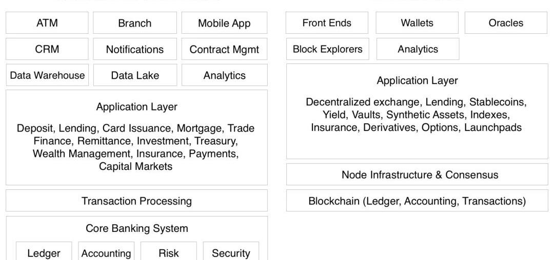 在比較DeFi基礎設施和傳統金融基礎設施時,有幾個部分值得探索的在去中心化的世界里還不存在。以下是一些需要強調的部分:消費者應用軟件——在傳統金融領域,消費者通常通過消費者應用軟件而不是底層協議本身行事。DeFi空間的前端可以得到極大的改善,并將更多的消費者體驗融入其中。一般來說,從消費者的角度來看,大多數DeFiApp程序的UI/UX仍然非常難以使用。CRM——DeFi空間并沒有真正的客戶關系管理概念,也沒有收集任何的消費者數據。雖然從隱私的角度來看很好,但更好地了解客戶也有很大價值。通知--在DeFi領域,通知或警報其實根本不存在。在更廣泛的層面上,也沒有任何好的方法來與用戶溝通。產品分析——有工具來衡量區塊鏈活動,但沒有工具來衡量DeFiApp中的參與度。安全-DeFi產品通常會進行安全審計;但是,沒有一個安全審計能保證消費者在傳統金融世界習慣了的和最常見的保護措施。除此之外,對安全審計師的需求超過了供應,這是一個很大的瓶頸。交易回滾——在傳統金融中,如果你犯了錯誤,金融機構可以啟動一個交易回滾。這在DeFi中還不存在。托管——現在,大多數DeFi項目需要從個人錢包的角度進行交互。沒有一個托管人讓你與DeFiApp程序互動。開發者平臺——加密貨幣領域的大多數開發者都是在Layer1協議本身的基礎上建立的。目前還沒有開發者平臺或中間件的概念。可嵌入的錢包——錢包被視為這些外部服務,沒有任何白標錢包的產品可以直接嵌入到DeFiApp程序本身。有幾個倡議,如Torus,但這些仍處于起步階段。身份——傳統金融界對DeFi最大的訴狀之一就是用戶的假名問題。理想情況下,需要有一種方法,在保護消費者隱私的同時,將不良分子拒之門外。金融應用的未來