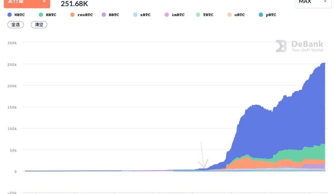 BTC跨鏈幣發行量:48倍隨著DeFi的發展,以太坊網絡對于BTC的需求增長很快,畢竟這也是一個原生加密資產,而且具有非常大的用戶基數和市值。BTC錨定幣的發行量從去年6月1日的5200個BTC,增長至如今的25萬個BTC,一年時間增長了48倍。