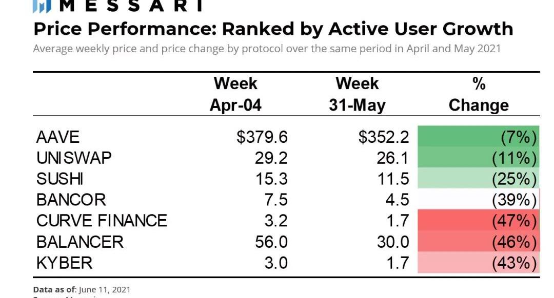 另一個需要考慮的因素是協議向其代幣持有人支付類似股息收益的能力。例如,SUSHI的代幣持有者可以質押他們的代幣,以獲得該協議的部分交易費用。下面是5月初開始的DEX協議同期價格表: