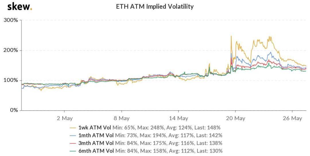 播報數據由Greeks.live和Skew.com提供。PutCallRatio在本輪牛市中不斷走高,在沖擊60000美元成功后,比特幣的PutCallRatio一度達到0.94。但是隨著市場轉熊,PutCallRatio一路下跌,現在已經跌回了0.69的平均水平。期權成交量7.72億美元,期權持倉量為69億美元。10d153%30d120%90d86%1Y72%各標準化期限隱含波動率:今日:1m97%,3m99%,6m99%,DVol114%5/26:1m107%,3m106%,6m110%,DVol120%比特幣這波反彈力度還是挺高的,但現在盤面壓力位很難突破,均線趨勢線各項指標都壓制著幣價,IV全面下降,看起來大部分投資者對后續行情都持小幅震蕩的觀點。