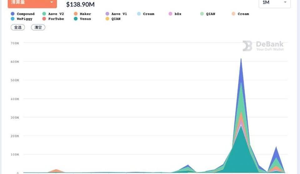 XRP/HKD-0.85%撰文:潘致雄在5月21日晚間政府機構發布了針對「打擊比特幣挖礦和交易行為」的要求之后,全球加密貨幣市場發生持續兩日的劇烈的震蕩,主流幣的單日跌幅高達30%,更多其他幣種的跌幅甚至超過50%。其實,市場在5月19日開始已經出現大幅調整,在這種極端的壓力測試下,又是一個可以很好的觀察DeFi體系運轉效率的機會——特別是當這個系統的參與資金量一度突破了1000億美元的里程碑,其中部分資產還在進行超額質押或者執行杠桿類的交易。過去這個周末行情的劇烈波動是自去年312之后少見的大范圍和高波動的黑天鵝事件。去年312加密貨幣市場出現閃崩,影響最大的是鏈上「央行」Maker系統中的清算引擎遭遇了部分問題,幸好后續通過拍賣、改進協議設計等方式恢復了運轉。在此次市場劇烈波動期間,MakerDAO未遭遇相同的問題。不過,去年312時,DeFi尚未成為主流,尚不是一個業內眾人皆知的方向,因為那時還沒有開啟流動性挖礦的熱潮,時至今日,DeFi世界的變化一日千里,DeFi業務的復雜度已經遠遠超過當時。在這樣的大背景下,再次經歷市場大幅波動之后,我們希望通過匯總一些DeFi世界的宏觀數據,結合一些核心DeFi協議在這個周末市場波動中呈現的數據,從點到面,清晰了解在此次的行情波動中,這些DeFi協議在這次黑天鵝事件引發的壓力測試中的表現。縱觀DeFi領域的整體表現
