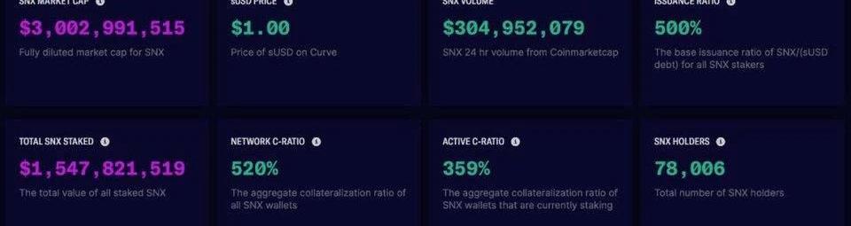 另一個重要數據就是抵押率。Synthetix官方數據平臺的數據顯示,抵押率目前還是維持在520%的水平,其他各項目數據也都維持在相對安全的水平線上。