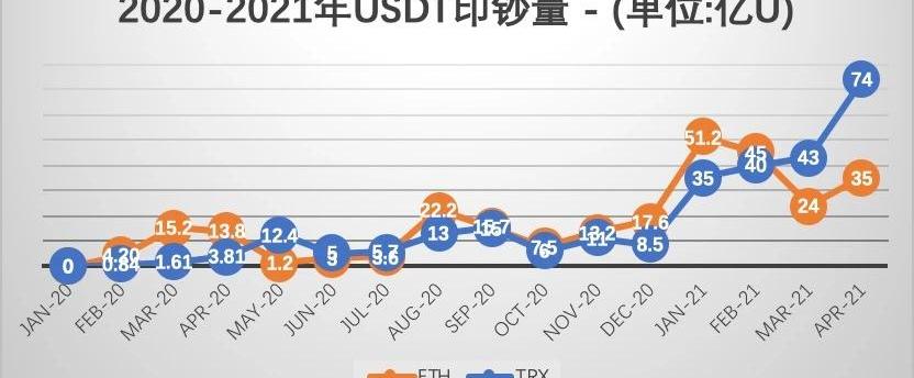 4月USDT凈印鈔共計109億枚,其中ETH印鈔35億枚,TRX印鈔74億枚。