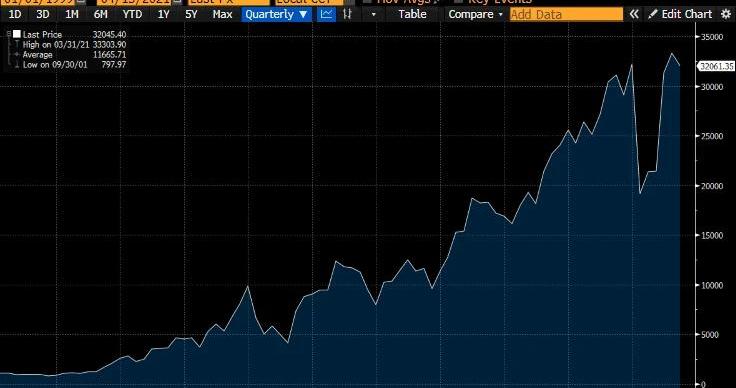 這是代表美國主要商業銀行的KBW銀行指數的走勢圖。如你所見,在2007年達到頂峰后,最近才超越了那個ATH。美聯儲為了拯救"大到不能倒"的銀行不惜一切代價,這些銀行還是用了14年的時間才奪回2007年的高點。