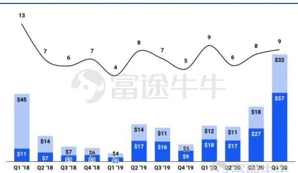 2、營收/利潤。營收方面2021Q1營收從去年同期的1.906億美元躍升至約18億美元,凈利潤從3190萬美元增長至7.3億-8億美元之間。而2020年全年Coinbase的營收才13億美元,凈利潤3億美元,也就是說,第一季度Coinbase的凈利潤已經達到了至少是去年全年利潤的2倍,按照這樣的比例換算,2021年Coinbase的全年營收將達到122億美元。