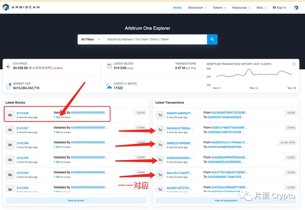 Layer 2 沒有區塊的概念其實,也沒有節點,也不需要共識機制,所以在 Layer2 方案的區塊瀏覽器上,其實看不到區塊的。現在去看 Arbitrum 的瀏覽器,還有一個 Bk,Block,仔細看看每個區塊其實就是每個交易,具體請看截圖。Layer 2 的運營者只負責把交易排個順序然后拿去處理。而區塊鏈的關鍵之處就在于對交易的排序工作。