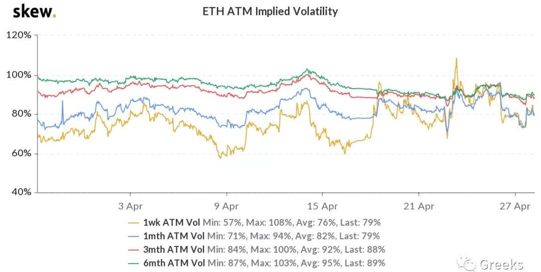 以太坊期權成交量3.97億美元,持倉量44億美元。10d101%30d91%90d93%1Y91%各標準化期限IV:今日:1m80%,3m88%,6m89%4/27:1m88%,3m94%,6m94%以太坊最近一個月以來,多多少少都會受到Fei的影響。如果Fei大量解鎖ETH,必然會對現有市場產生沖擊,現在ETH現在主要是ERCDeFi的影響,需要高度關注消息面。目前隨著上漲,IV反而在下降,中短期Skew也回到了右偏。