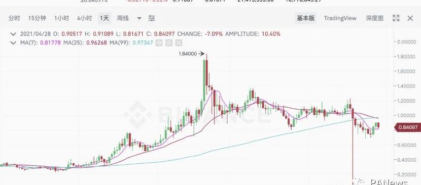 從去年RenProtocol發布renBTC以來,以去中心化的方式將BTC鎖定,并在以太坊上發行BTC錨定幣才有了能走通的方案,至此比特幣錨定幣演進到第三代。用戶將原生BTC存入RenBridge網關,Ren的虛擬機RenVM通過智能合約在以太坊上發行renBTC。除了鑄幣用戶1:1抵押的原生BTC外,要發行renBTC還需要節點進行質押。RenProtocol中的節點被稱為暗節點,每個節點需要抵押10萬個REN代幣,每個分片上的節點集體抵押的REN不少于BTC價值的三倍。而目前REN的流通市值只有8.37億美元,以現在的BTC價格計算,即使將所有的REN進行質押,也只能生成5211枚renBTC。即便如此,因為REN的價格波動很大,三倍的超額抵押也不能確保網絡的安全性。2021年4月18日,幣安上REN的價格在短時間內就從1.1美元跌至0.015美元,下跌超過98%。此時,節點的抵押品價值相對于已發行的renBTC接近于零。